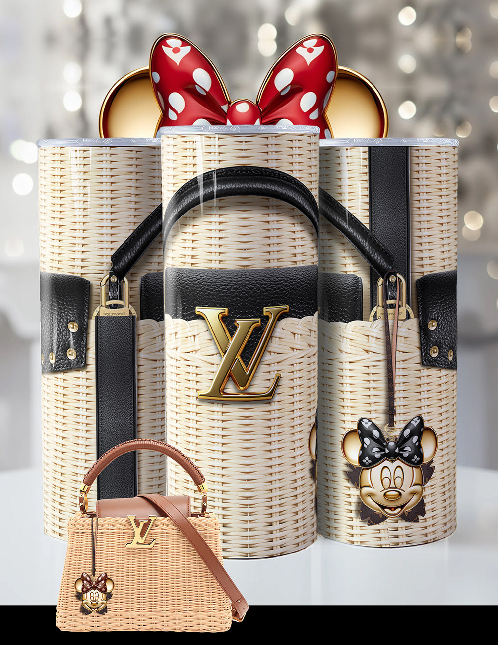 Turn your everyday sip into a runway-ready fashion moment with this Minnie Mouse–inspired luxury tumbler. Designed to look like a chic wicker handbag, complete with a black faux-leather strap and gold-tone designer-style accents, this tumbler is the perfect blend of Disney magic and high-fashion vibes. Topped with Minnie’s iconic red bow and mouse ears, it’s a must-have for anyone who loves adding a little glam to their daily routine.